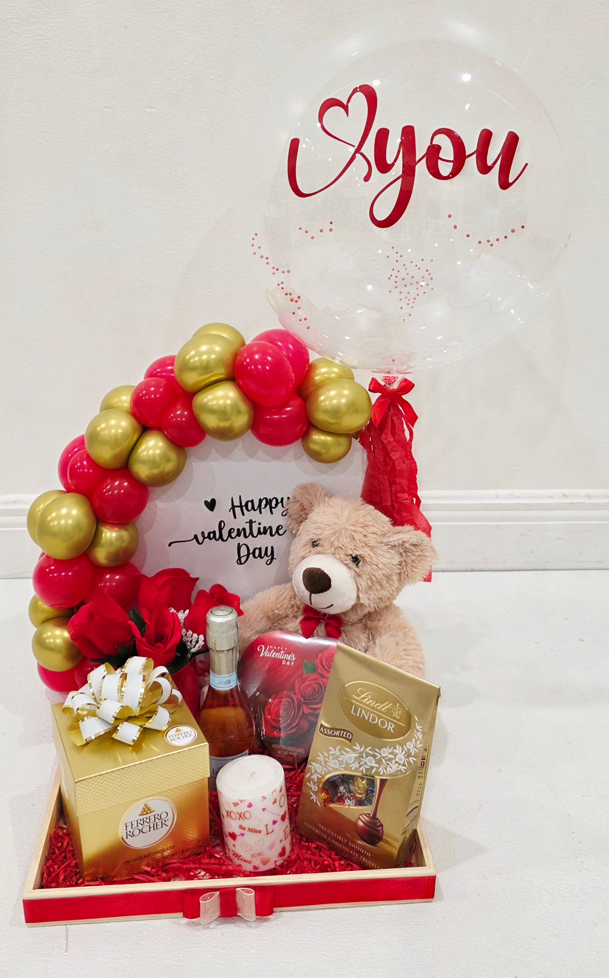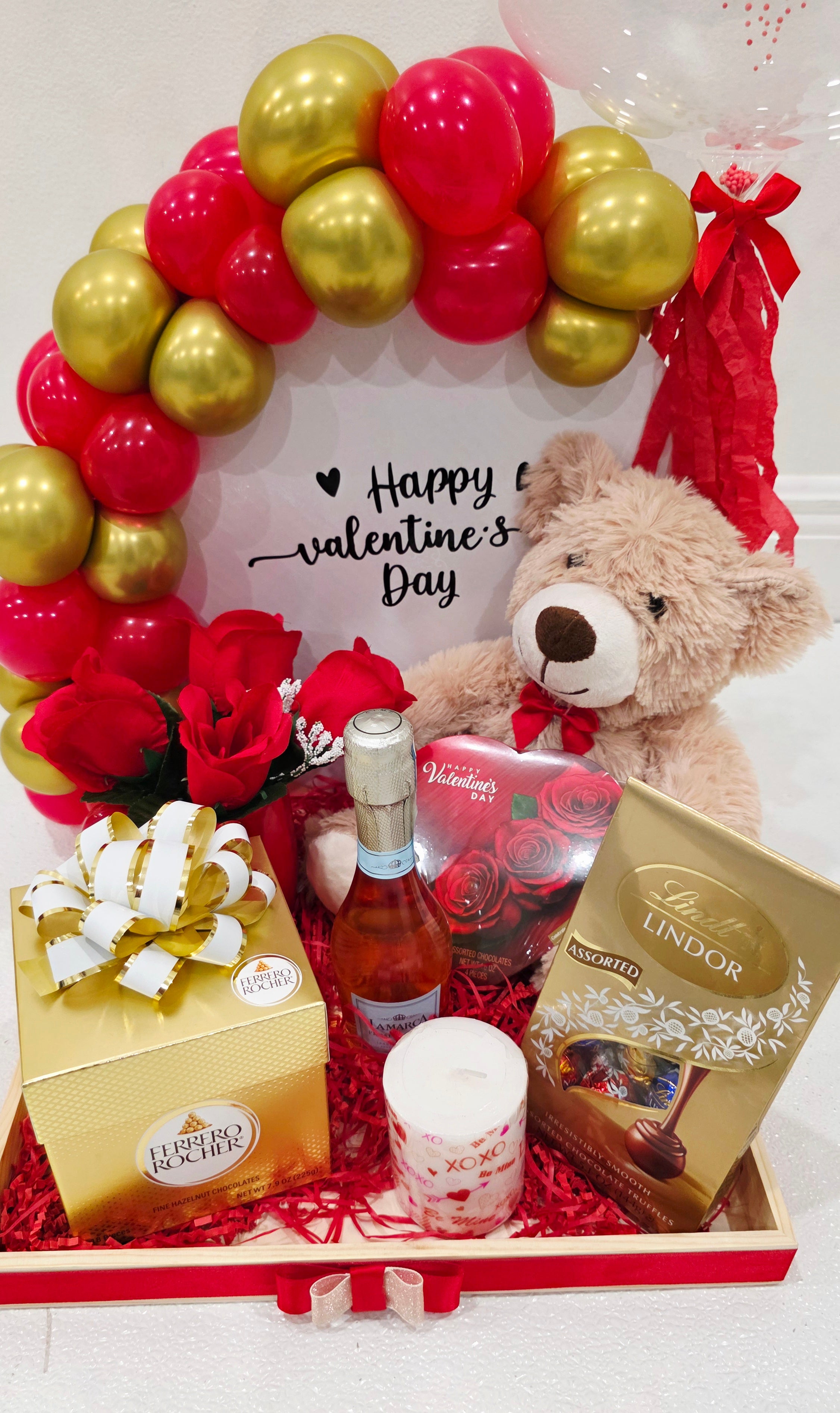 - Cada arreglo incluye un oso de peluche, Premium chocolates (Ferrero Rocher & Lindt Lindor), una vela, Mini champaña.